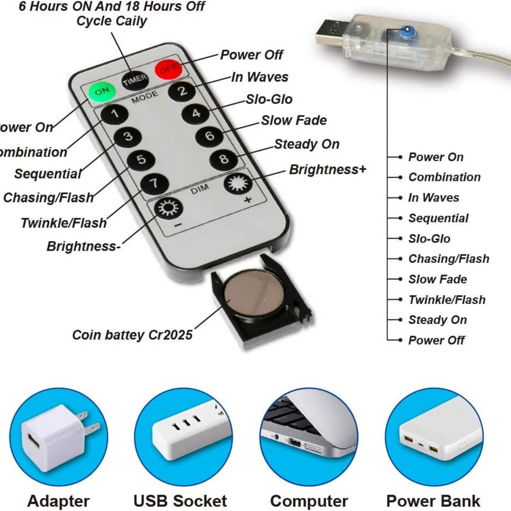 Each mode will bring you a different romantic atmosphere. including combination, in waves, sequential, slogs, chasing/ flash, slow fade, twinkle/ flash, and steady on. And it will remember the setting when be turn on next time. USB powered, which can be used by plugging it into the computer, power bank or USB interface. 5V low voltage to can be safely touched. 6 hours On and 18 hours Off automatically every 24hrs once TIMER activated.