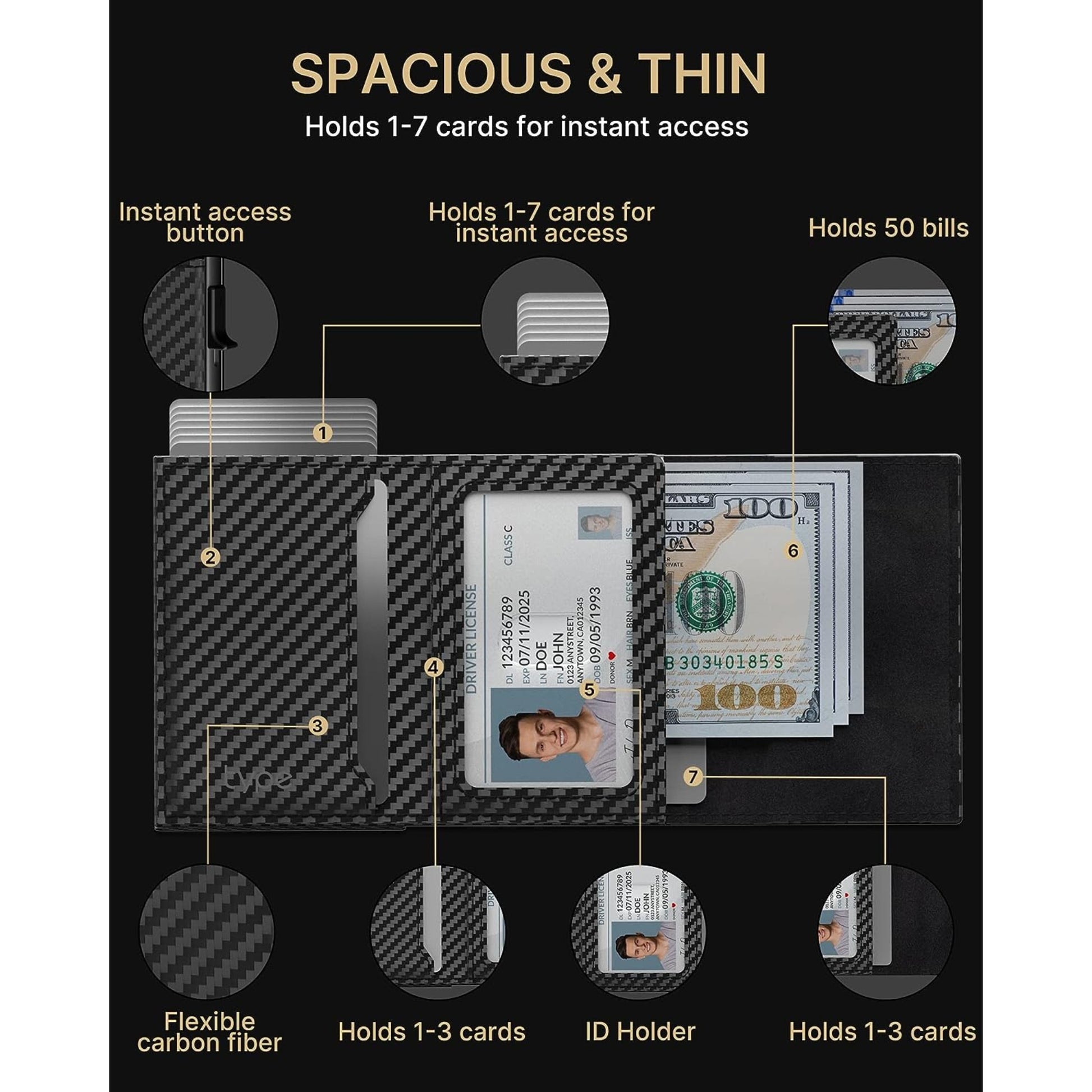 Premium Carbon Fiber Design: This card holder features a sleek and stylish carbon fiber exterior that not only looks great but also offers durability and resistance to wear and tear.