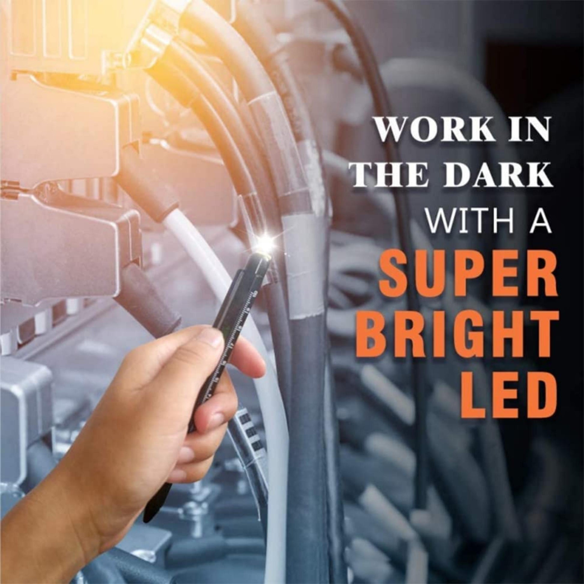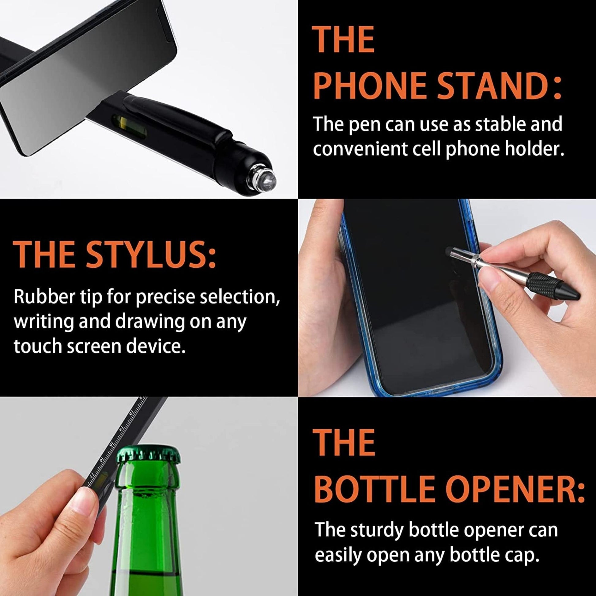Features: Led Light, Stylus, Rulers, Bubble Leveler, Bottle Opener/Phone Stand, Flathead and Phillips screwdriver bits, and a Retractable Pen. The product can meet your multiple needs.