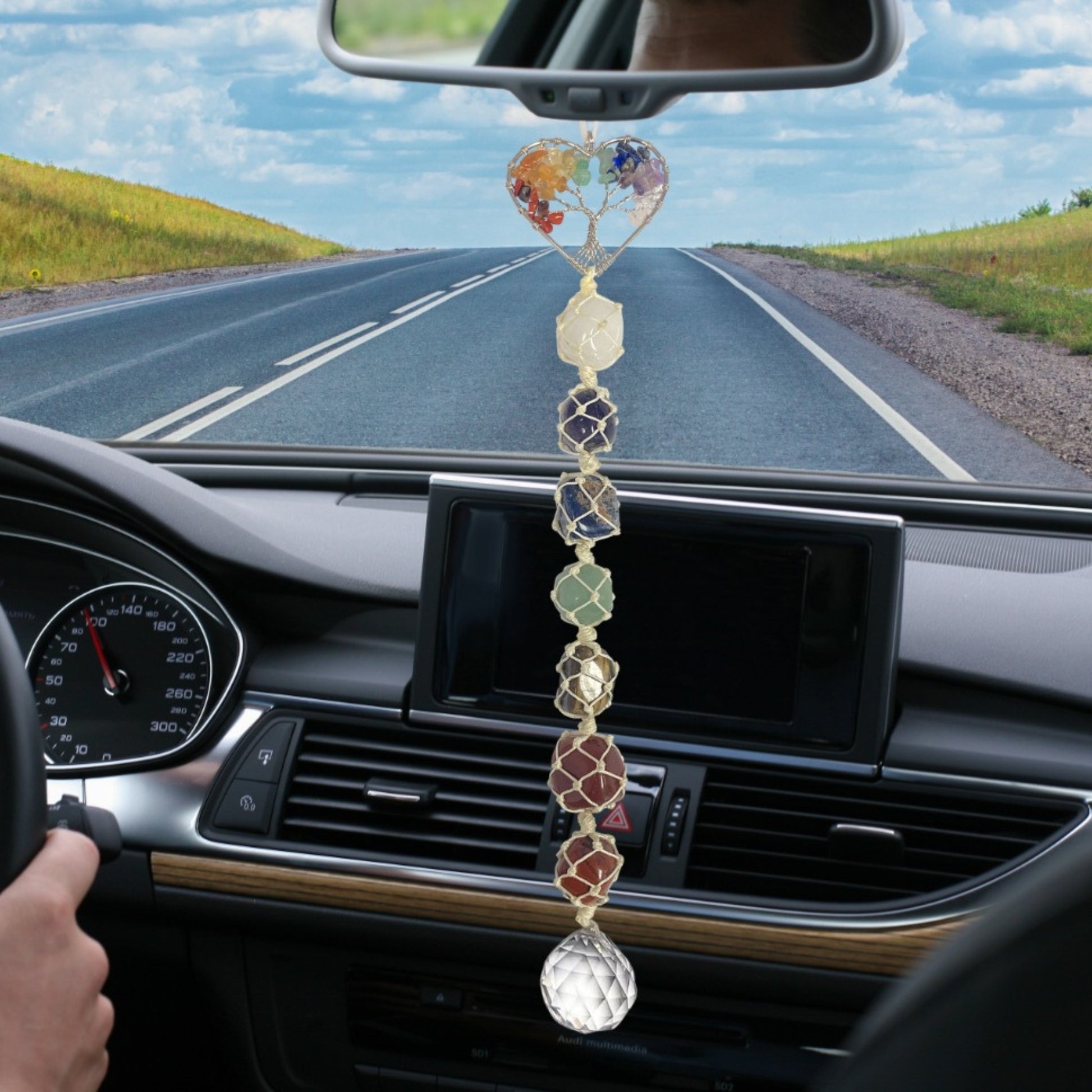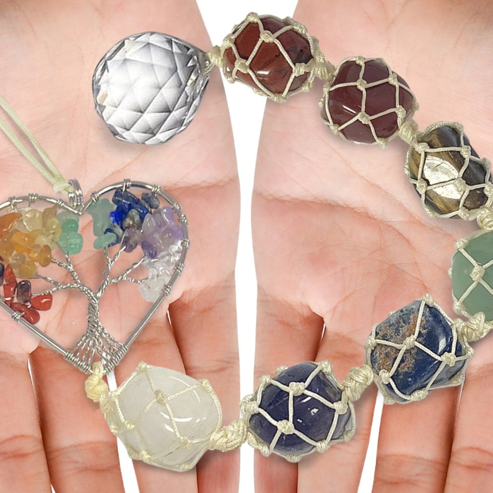 - 7 Chakras Healing Crystals: Clear Crystal Quartz, Amethyst, Lapis Lazuli, Green aventurine, Tiger eye, Yellow Jasper, Red Agate.