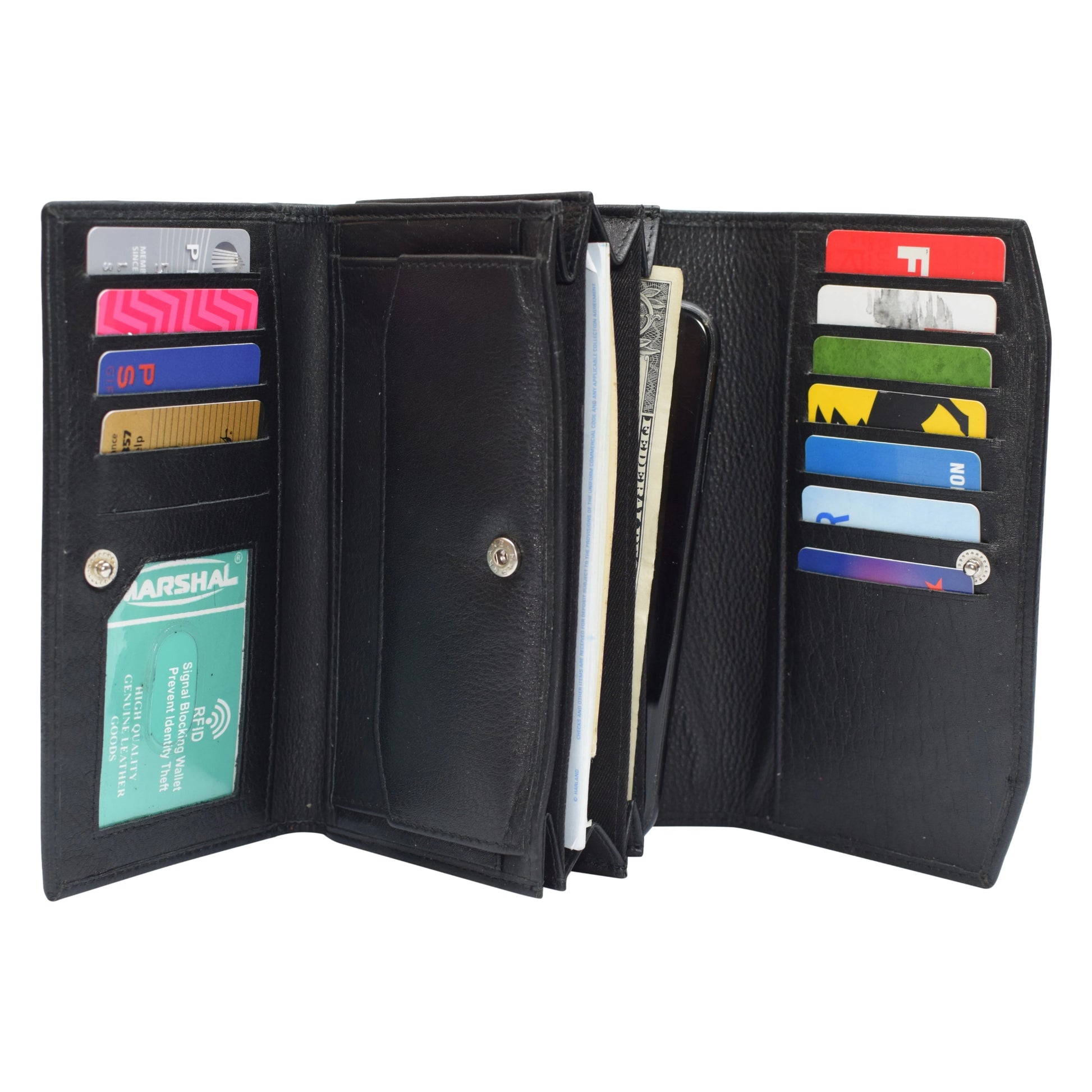 Accordion Trifold Design: The wallet features an accordion-style trifold design with multiple compartments, offering ample space to organize your essentials, including cash, cards, coins, and even your smartphone.